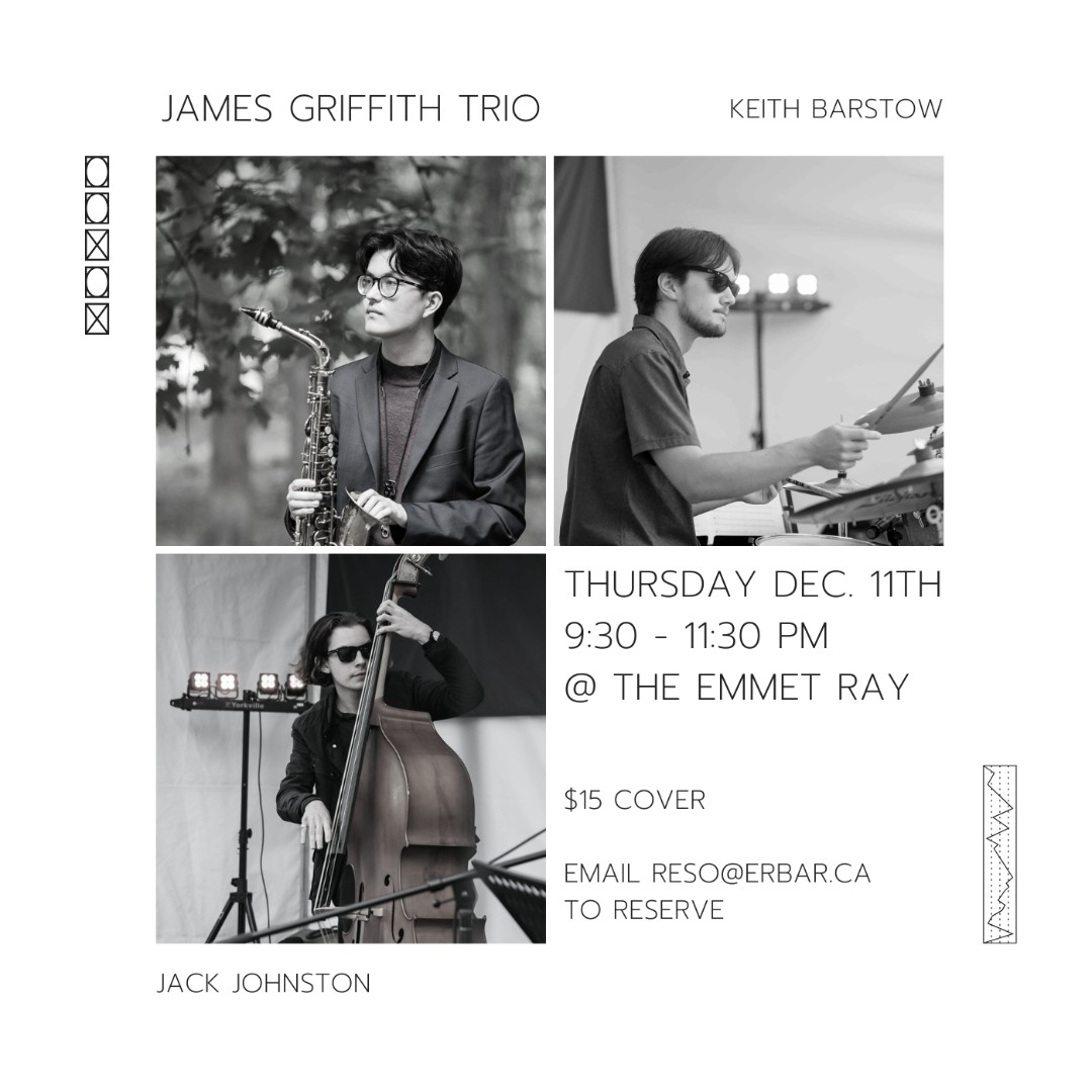 James Griffith is a national-award winning young rising star of Canadian jazz. Winner of the 2024 International Saxophone Symposium Jazz Saxophone Competition, Griffith is an active member of the Toronto music scene and many groups including Listening Room, Marmalade, the Live Video Game Jazz Orchestra and more. On Thursday December 11th he will present a program of American Songbook and Jazz standards in the trio format with all star bassist Jack Johnston and drummer Keith Barstow.