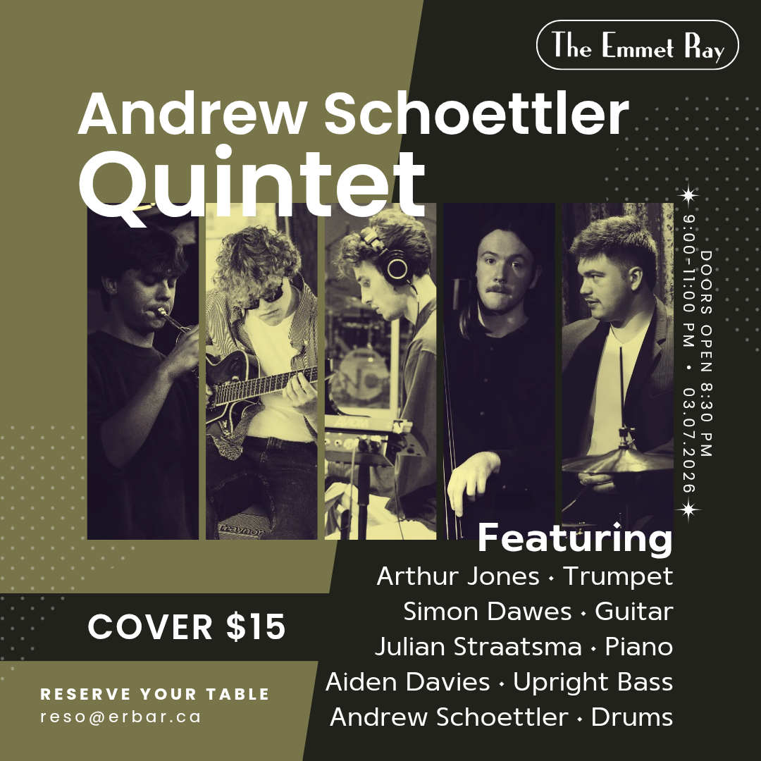 The Andrew Schoettler Quartet plays a mix of jazz standards and loose arrangements, with lots of space to stretch and listen. It swings, it grooves, and it doesn’t overthink things. Just four musicians making honest music together.
