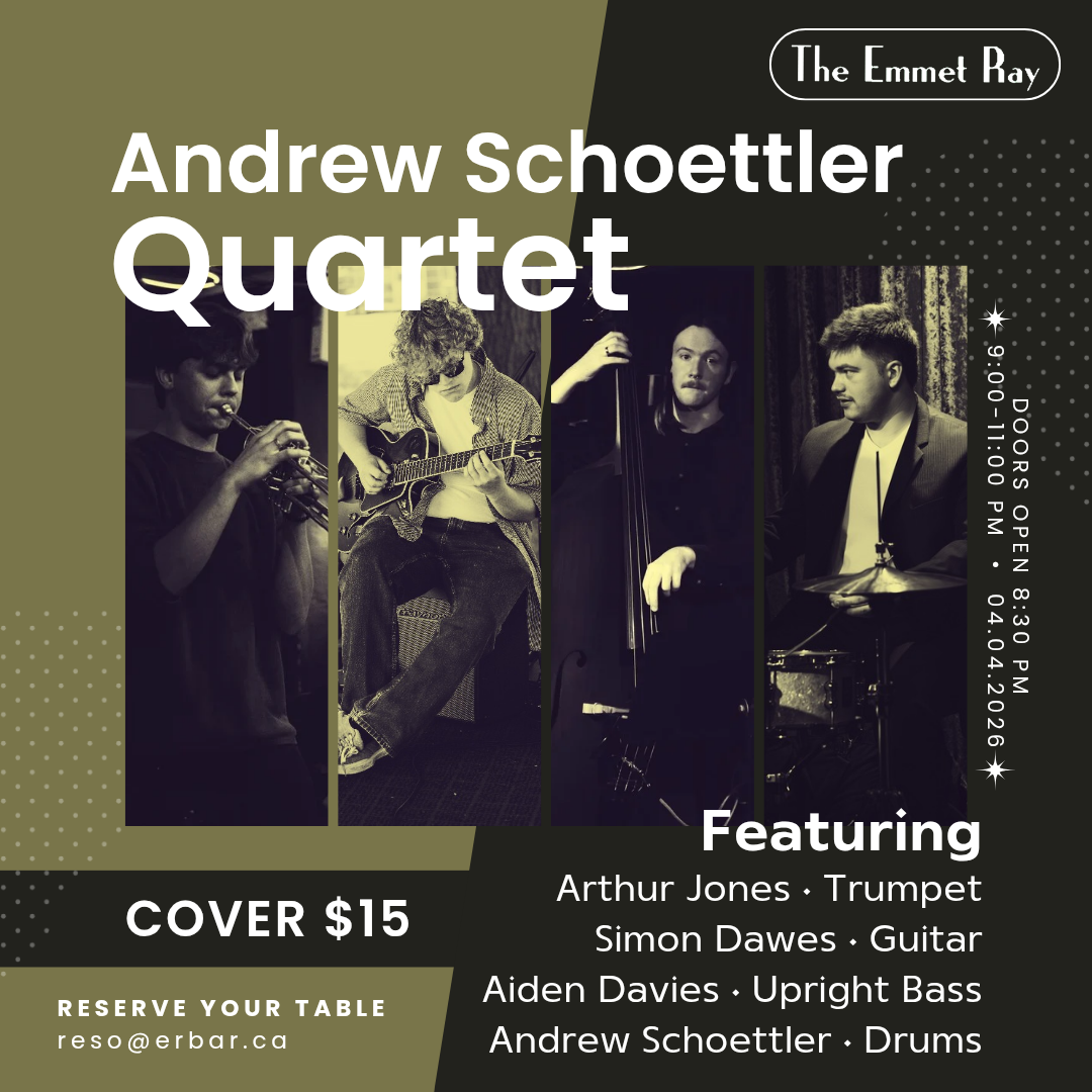 The Andrew Schoettler Quartet plays a mix of jazz standards and loose arrangements, with lots of space to stretch and listen. It swings, it grooves, and it doesn’t overthink things. Just four musicians making honest music together.