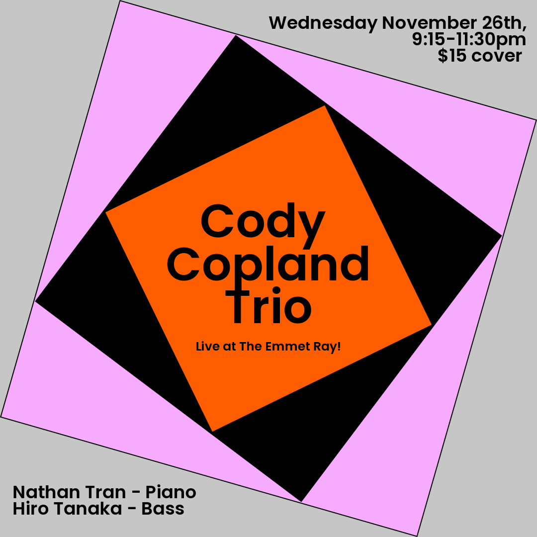 Cody Copland Trio features guitarist Cody Copland with Hiro Tanaka on bass and Nathan Tran on piano. The group focuses on straight ahead bebop, using the guitar led trio format to highlight great tunes, swing, and interplay among band members. There have been many bands throughout the history of jazz that feature this ensemble, such as early Nat King Cole, Tal Farlow, Billy Bean, and more. This band seeks to emulate those great groups of the past with their own interpretations of the standard repertoire.
