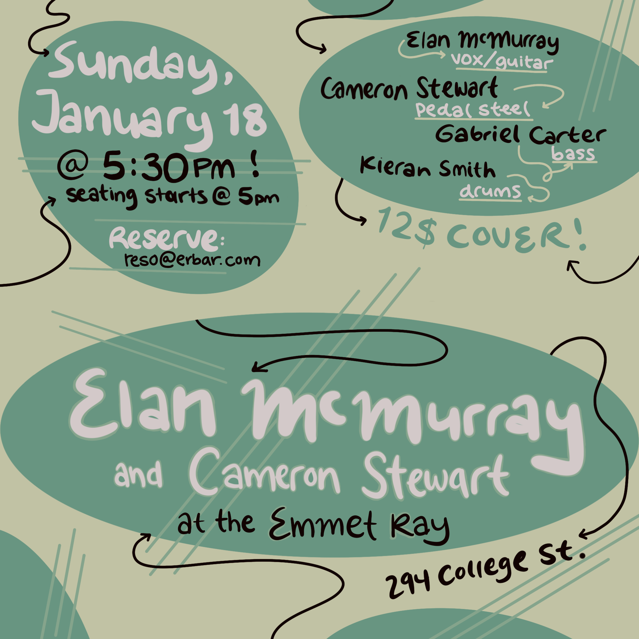 Our band features vocalist Elan McMurray accompanied by pedal steel guitarist Cameron Stewart performing a mix of familiar soul, country, and pop repertoire. Our collaboration, joined by Kieran Smith (drums) and Gabriel Carter (bass), is one of carefree interplay and joy.