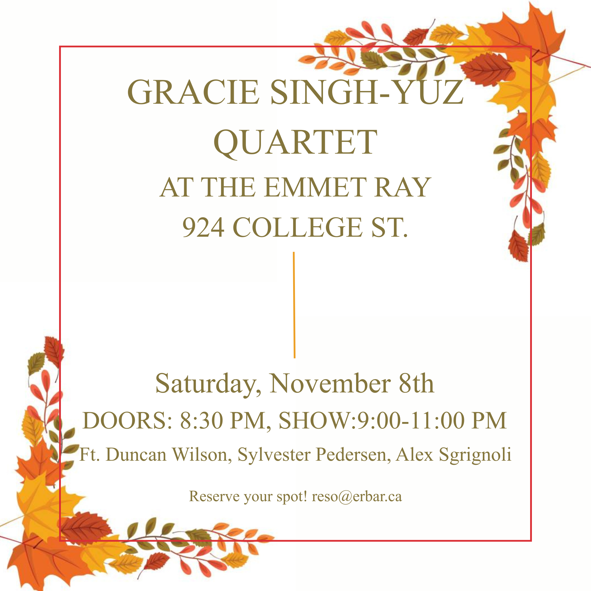 This jazz quartet will perform some of our favourite classic jazz standards that audiences know and love. Led by jazz vocalist Gracie Singh-Yuz, you will hear these songs in a classic vocal jazz style. Her style and setlist curation are reminiscent of vocalists such as Ella Fitzgerald, Nat King Cole, Blossom Dearie and more. Join us as we share our love and dedication to this music for an unforgettable night!