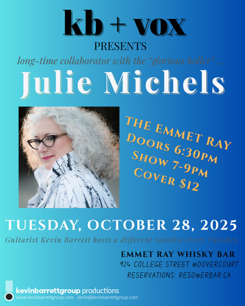 Kevin Barrett be hosting a weekly early-Tuesday-evening series at the Emmet Ray (College & Dovercourt), featuring a different singer each week. Kevin is privileged to be able to make music with some of the finest vocalists anywhere, and really happy to have a regular chance to do so. Please come out, enjoy the Emmet Ray’s beautiful room and fine food & drink menu, and hear some great music.