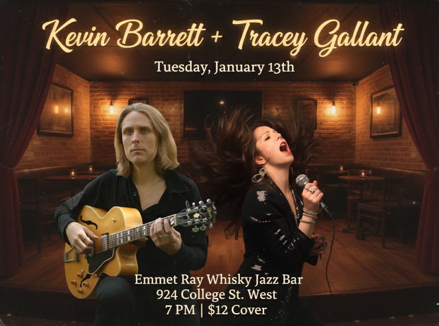 Kevin Barrett be hosting a monthly early-Tuesday-evening series at the Emmet Ray (College & Dovercourt), featuring a different singer each month. Kevin is privileged to be able to make music with some of the finest vocalists anywhere, and really happy to have a regular chance to do so. Please come out, enjoy the Emmet Ray’s beautiful room and fine food & drink menu, and hear some great music.
