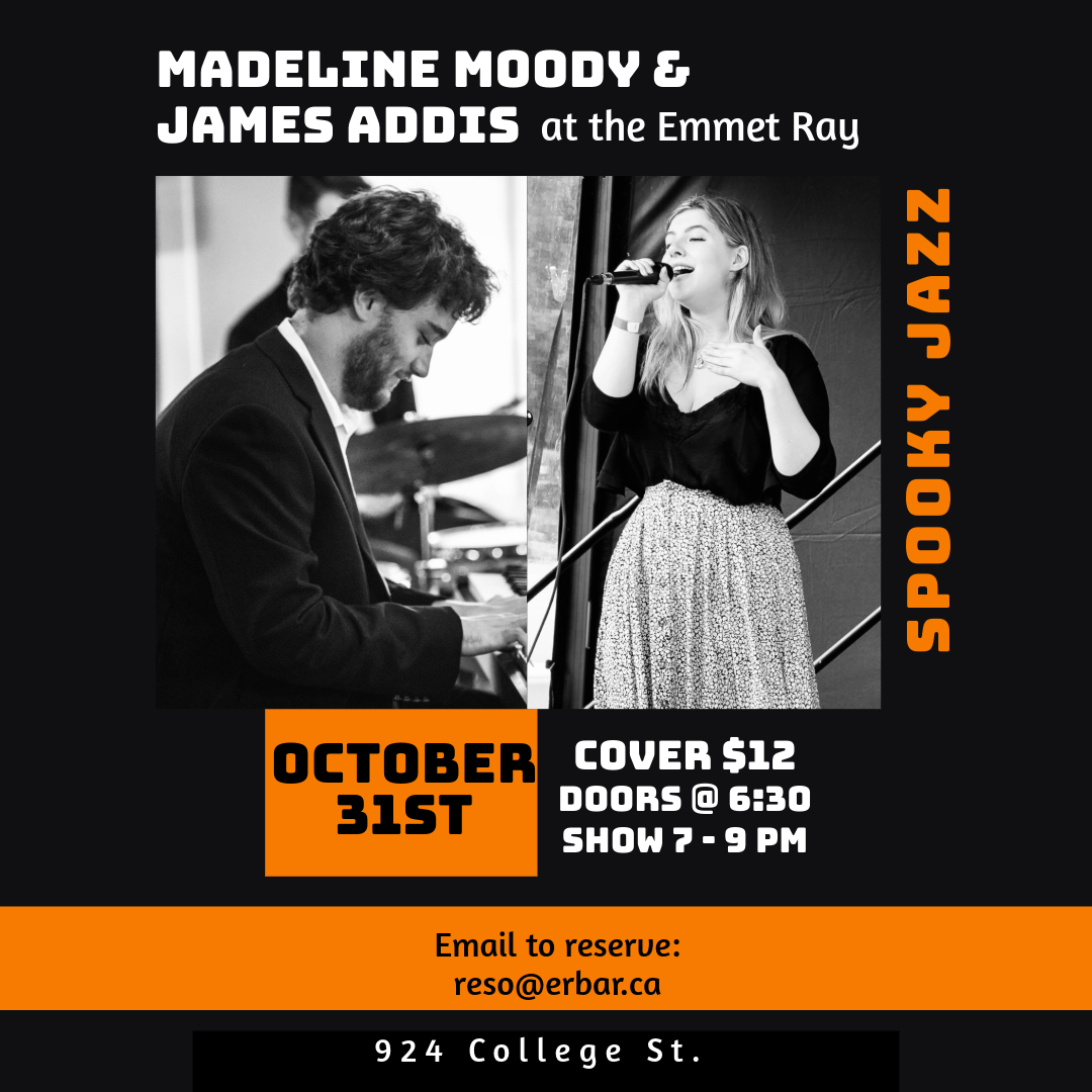 Join us this Halloween for an evening of hauntingly good vocal and piano jazz! Hear Madeline Moody and James Addis perform soulful ballads, celestial swing, and Halloween inspired favourites to celebrate the spookiest day of the year!