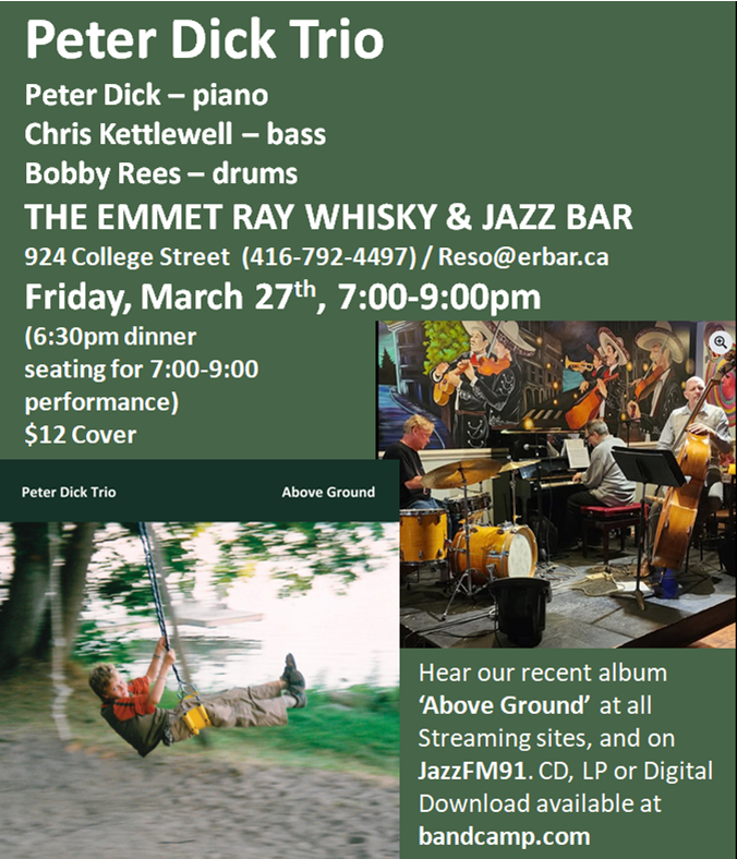 Peter Dick Trio is a progressive Jazz Piano Trio, playing original repertoire plus modern jazz standards – from ballads to up-tempo kickers! Our latest album, ‘Above Ground’, gets regular airplay on JazzFM91, and is up at all major streaming sites.