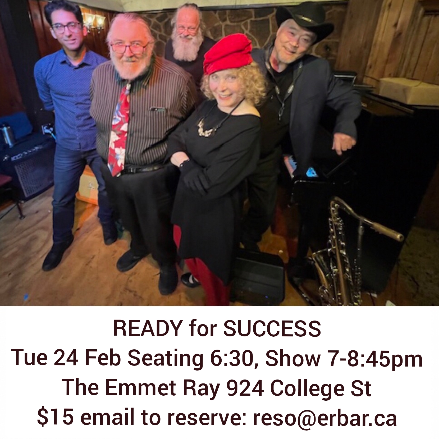READY FOR SUCCESS is a new band of veteran musicians who have recently completed a year-long Friday residency at the renowned Imperial Pub (now defunct). They are a five-member jazz band who perform some standards, but mainly focus on original instrumental tunes and songs by members Tony Quarrington (guitar/vocals) and Zoey Adams (vocals). These two have released seven albums of their compositions, and in 2025 they joined forces with the trio of Bruce Tatemichi (piano/sax/flute), Chester Manoharan(bass), and Pierre LeGendre (drums). Besides their long residency, they have performed at the Tranzac, My House in the Junction, and Momiji. As yet unreleased is a live recording made at the Imperial in its last weeks.