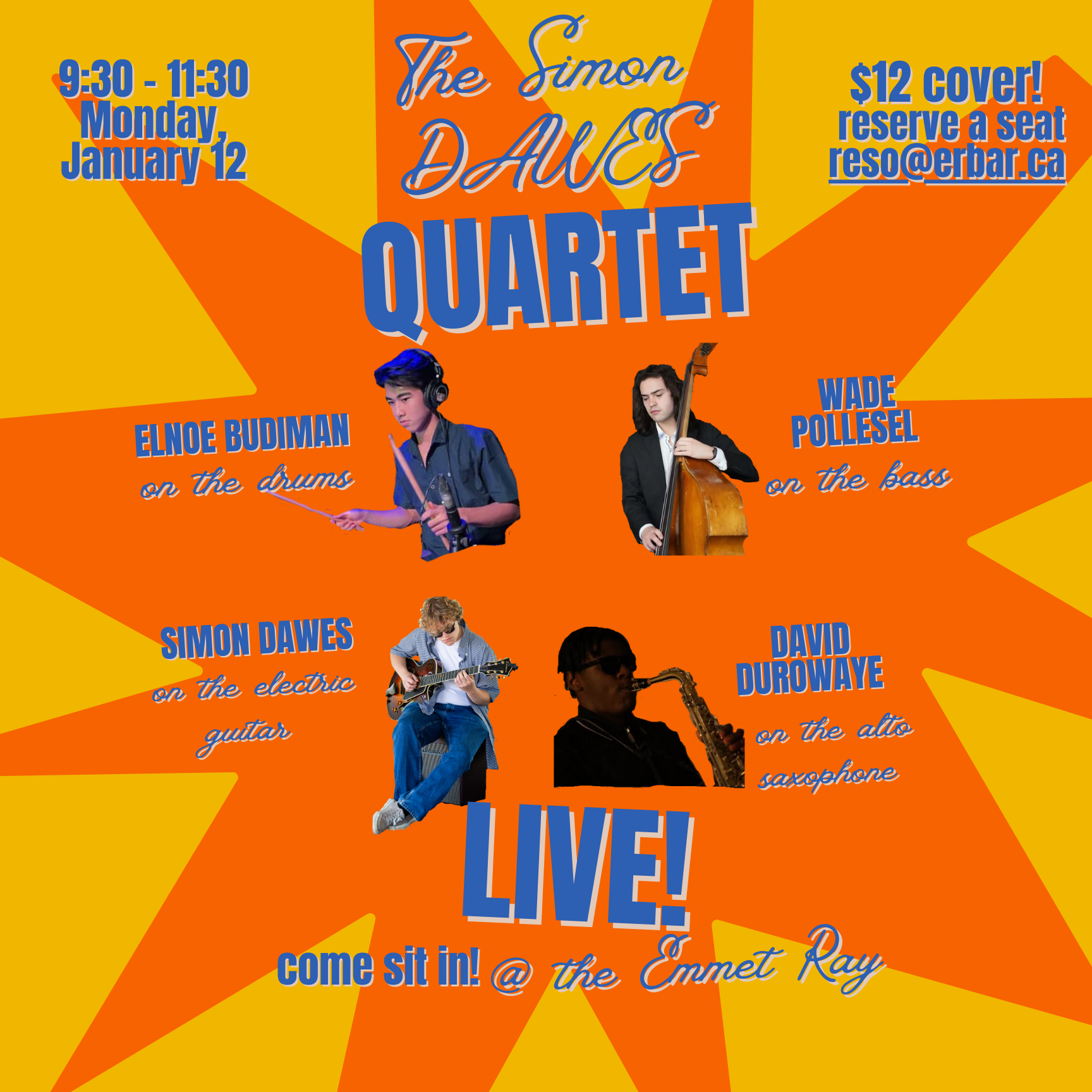 A quartet fronted by Simon Dawes. A Toronto guitarist currently studying at the University of Toronto whose resume includes playing jazz at various venues in Toronto, and other styles of music throughout the province. Joined by three other UofT students Wade Pollesel, Elnoe Budiman and David Durowaye. Also Welcoming friends of the band to join in for the second set, sure to be an entertaining night of music to usher in a new year of jazz.