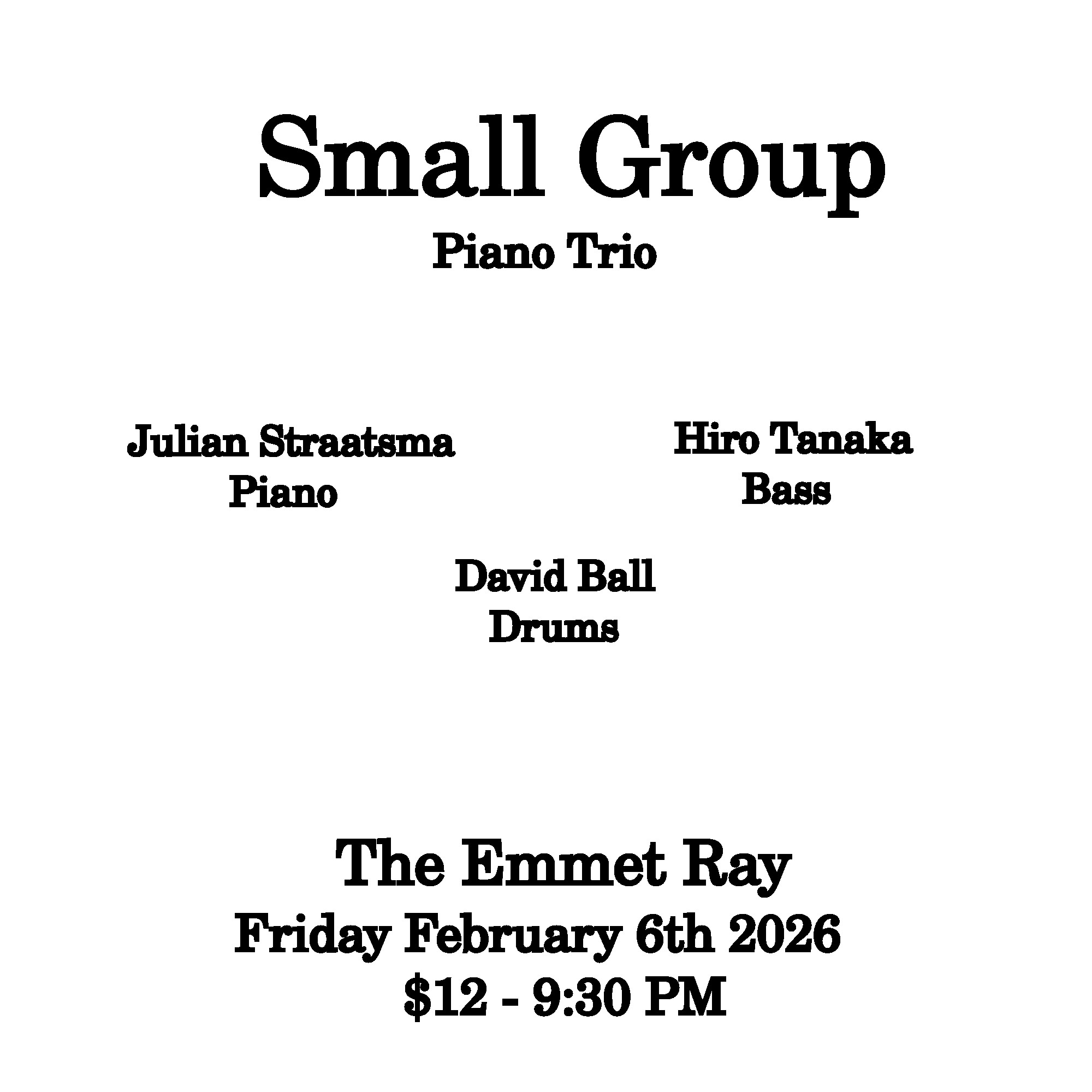 Small Group is a jazz piano trio consisting of Julian Straatsma (piano), Hiro Tanaka (bass), and David Ball (drums). The trio met in college, and have played together throughout the years. They play music in the styles of Oscar Peterson, Wynton Kelly, and McCoy Tyner, and draw influences from various bebop musicians from the 1950’s till now.