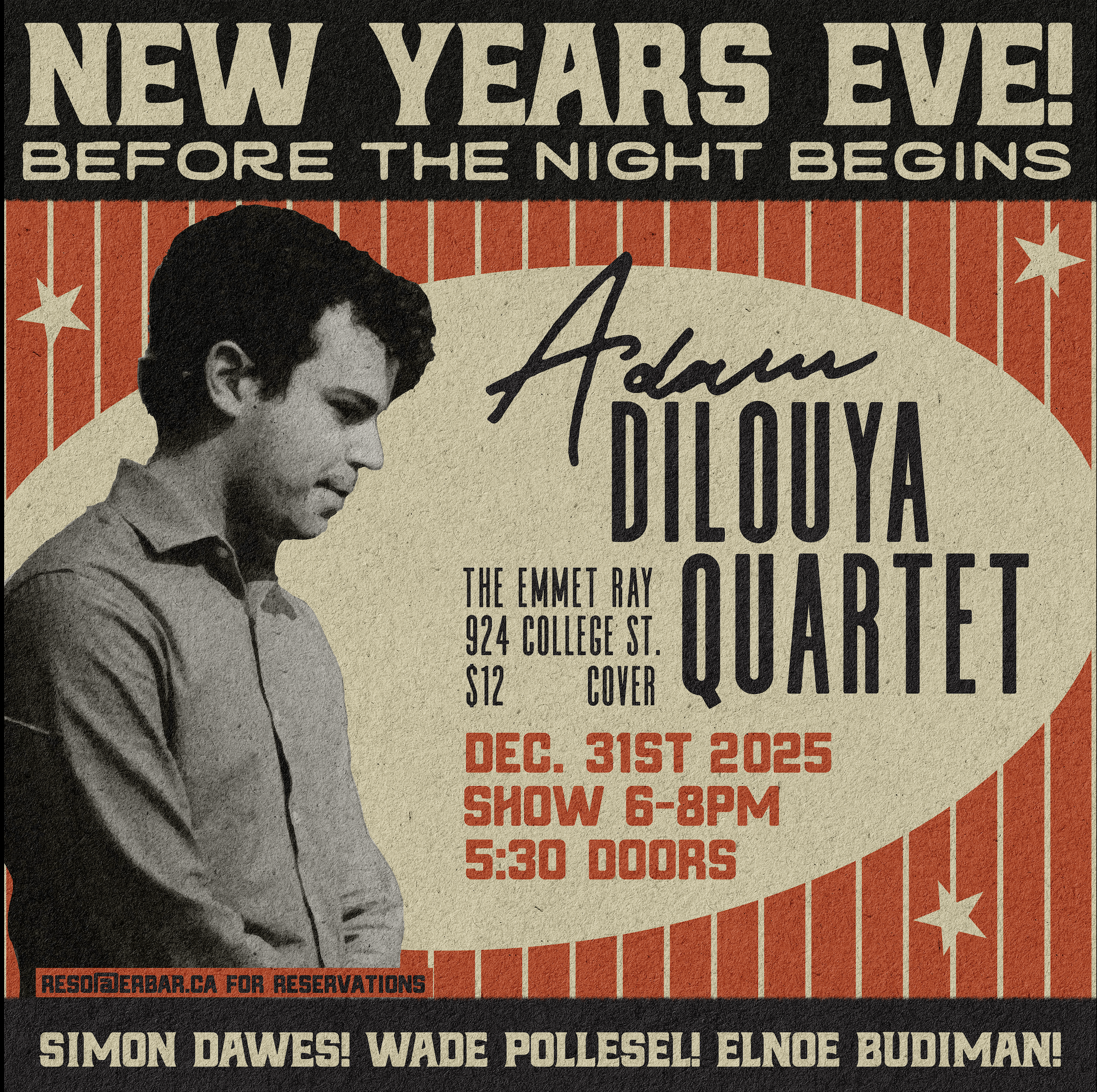 Join the Adam Dilouya quartet for an evening of jazz ballads and swing tunes at the Emmet Ray before ringing in the New Year! Adam will be joined by Simon Dawes on guitar, Wade Pollesel on bass, and Elnoe Budiman on drums.